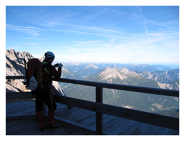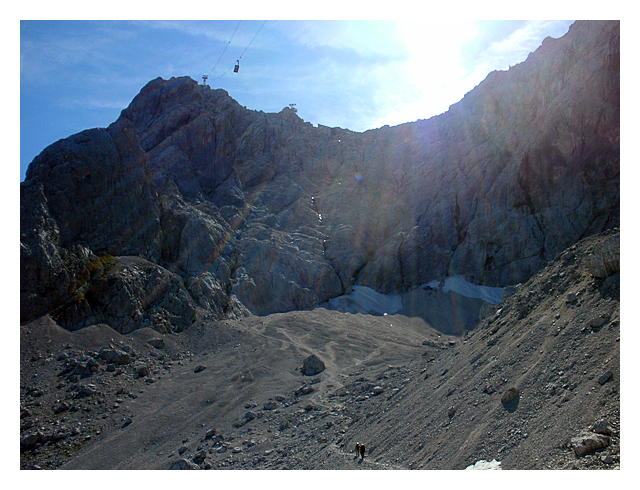 Noch ein letzter Blick zurück auf die Zugspitze, wo wir heute Morgen noch gestanden haben. Man kann von hier den Pfad im Geröll erkennen, der dann links in den Fels mündet. Dort geht es über den Stopselzieher hoch. In der oberen Hälfte verläuft der Pfad dann in einem großen Bogen nach rechts und wieder nach links zurück zur Gipfelplattform.