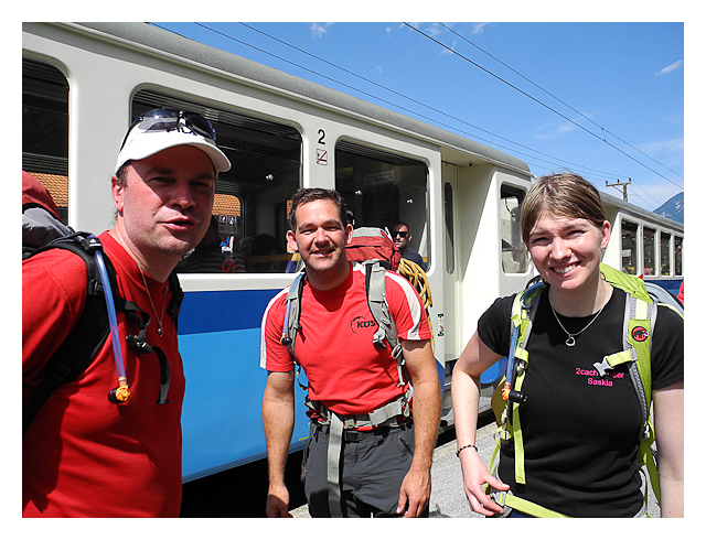 Glücklich und zufrieden steigen wir aus dem Zug. Na ja auch mit einem schlechten Gewissen – wir mussten schwarz fahren, da an der Haltestelle Riffelriß kein Fahrscheinautomat ist und wir im Zug auch keinen Schaffner gefunden haben.
