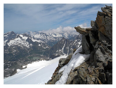 Dort mussten wir die Steigeisen ausziehen und noch neun Seillängen im III. Grat über gut griffige Felsen klettern. Günter machte dabei den Vorstieg und wir folgten gut gesichert. Immer wenn Günter im Vorstieg unterwegs war, hatten wir wieder Pause, was in 3200m Höhe auch wirklich gut tat.
