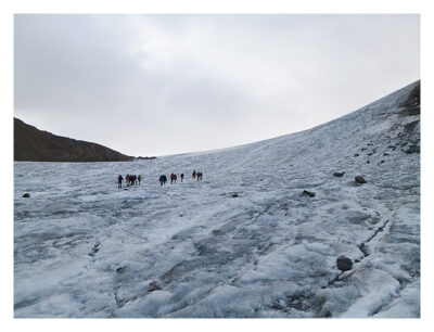 Nach einem kurzen Spaziergang über Geröll erreichen wir das Eis. Wir legen unsere Gletscherausrüstung an und seilen uns an.