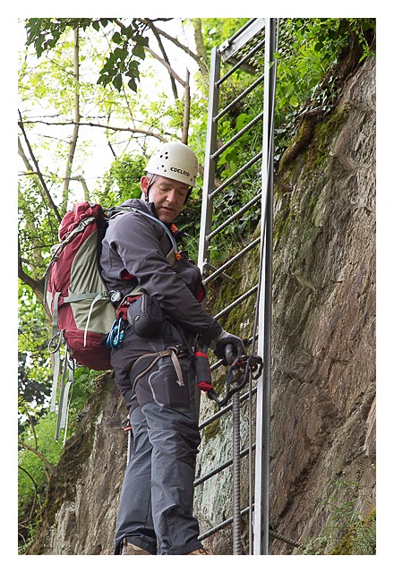 Extrem skurril war dann die Situation, als die ersten Kandidaten im letzten Steilstück irgendwo in der Mitte in voller Montur gesichert gemütlich pausierten, unten noch die letzten Kandidaten mit wichtigem Habitus in ihre Messner-Strapse stiegen, und dann 3 Jogger in Turnschühchen vorbeikamen, die uns mal eben an der Stelle über die Stufen überholten, weil das wohl ihre übliche Sonntags-Laufrunde war. Da kommt man sich schon ein bißchen albern vor.