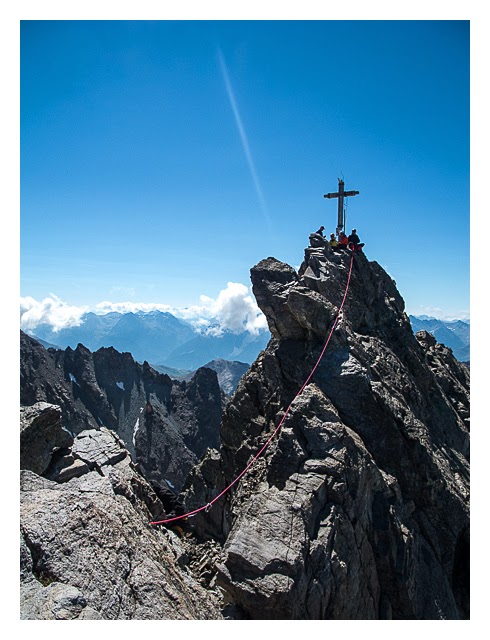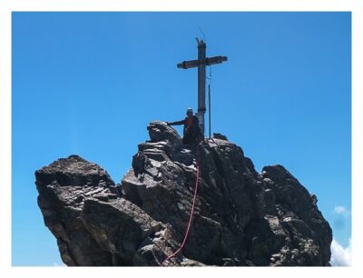 Nun wird es Zeit, auch das Gipfelkreuz zu besuchen. Eine „etwas“ ausgesetzte Kletterei am Grat. Trotz UIAA I entscheiden wir uns am Seil zu klettern – wir als Flachlandtiroler wollen einfach kein Risiko eingehen – Sicherheit geht vor. Ich mache den Vorstieg – es geht überraschend gut. Der Fels ist kompakt und gut griffig. Ich erreiche das Kreuz und mache daran „Stand“.