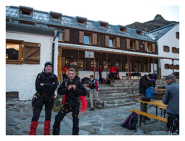 Wie immer schmeckt das Frühstück auf der Hütte besonders gut – ich entscheide mich heute für Müsli – gibt Kraft und hat viel Flüssigkeit, die ich heute noch rausschwitzen kann. Kurz vor Sieben treffen wir uns vor der Hütte und ziehen schon mal die Klettergurte an. Wäre an dieser Stelle zwar noch nicht nötig, spart aber dann am Gletscher etwas Zeit. Götz ist heute dran mit Seilschleppen ;-)