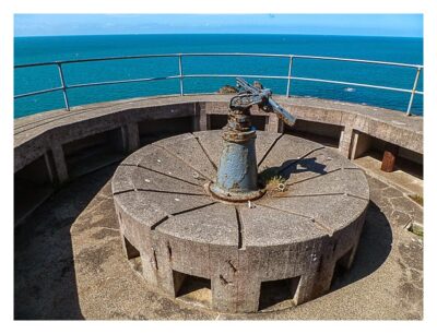 Auf dem Beobachtungsturm sind noch die kläglichen Reste eines Flak-Geschützes übrig.