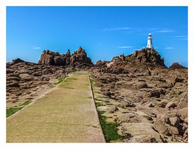 Vom Noirmont Point sind es sieben Kilometer auf einer vielbefahrenen Straße zum Leuchtturm Corbière, der auf einer kleinen Jersey vorgelagerten Insel steht. Bei Ebbe ist er über einen betonierten Weg leicht zu erreichen. Unterwegs sammeln wir noch den Tradi „Waiting for Rosie“ ein.