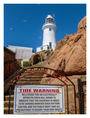 Der Tidenhub auf den Kanalinseln beträgt mehr als 10 Meter. Daher gibt es überall Warnschilder, die vor der Flut warnen, die knapp alle sechs Stunden mit der Ebbe abwechselt. Am Leuchturm liegt noch der Earthcache „La Corbière„. Da man hier ein Foto bei Ebbe und eins bei Flut machen soll, gestaltet sich das Ganze für uns schwierig, da wir nicht so lange hier bleiben wollen. Zum Glück akzeptiert der Owner auch so unser Log.