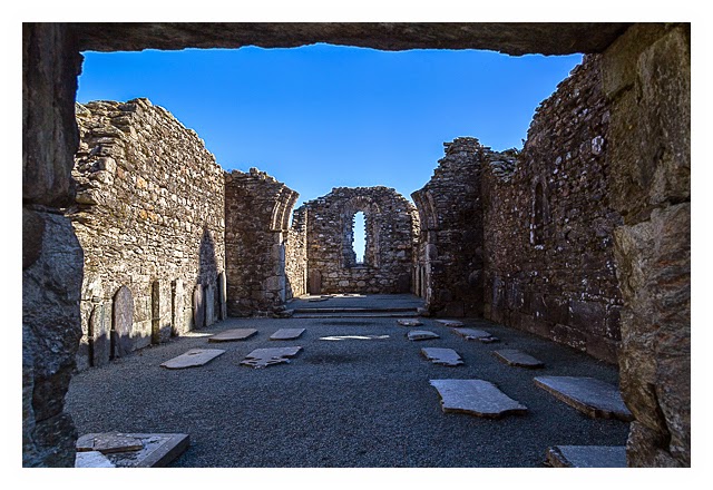 Das Gelände dieser Siedlung wird auch als Friedhof genutzt – überall stehen Grabsteine. Viele davon sind in Form des keltischen Hochkreuzes.
