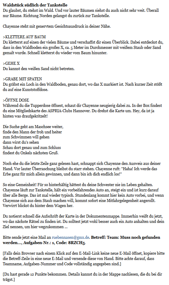 Was macht man mit Bäumen – klar, man(n) klettert hoch. Oh ein Kreuz markiert das Final? Sand? Na, graben wir doch mal! Und schwups haben wir eine Dose gefunden. Nach dem Öffnen haben wir schon die erste Aufgabe erfüllt und dürfen eine Mail an die Rübennasen mit dem Code schicken…