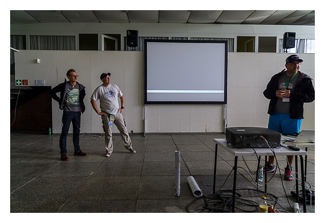Um ein Uhr mittags finden wir uns an einer der Hallen ein. Auch hier ist wieder Schlange stehen angesagt. Der Einlass verzögert sich, da das GcTransAlps-Team noch an der Technik rumwerkelt.