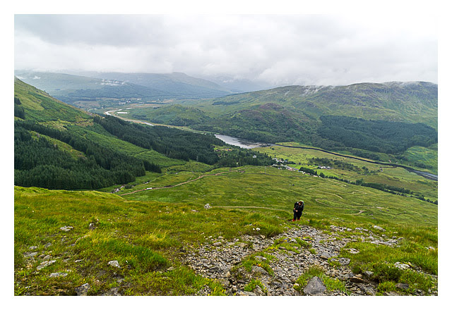 Am nächsten Morgen läßt uns leider das Wetter im Stich: In der Nacht hat es schon geregnet und im Moment hängen dunkle Wolken über dem See. Nach dem Frühstück brechen wir auf Richtung Crianlarich. Nach einer guten halben Stunde haben wir die Ben More Farm erreicht. Dort können wir an der Straße parken. Wir ziehen unsere Wanderschuhe an.