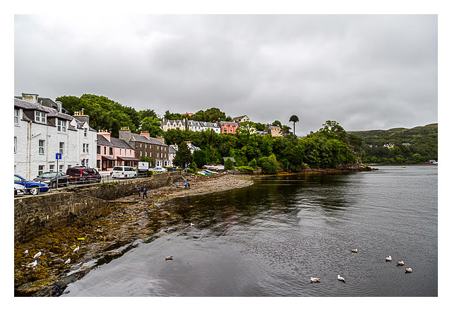 Am frühen Nachmittag erreichen wir Portree. Im Stadt-, oder sollte ich besser sagen, im Dorfzentrum gibt es einen großen Parkplatz, auf dem wir unser Auto abstellen. Wir spazieren Richtung Hafen. Bevor es die Treppen zum Meer hinunter geht, treffen wir auf diesen jungen Dudelsackspieler, der sich so etwas Geld hinzuverdient. Kaum sind wir da, beendet er jedoch seine Performance – es beginnt gerade wieder zu regnen.