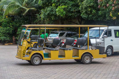 Nun spazieren wir zum Vordereingang über einen breiten und gepflasterten Weg. Der Wassergraben vor der äußeren Mauer wird von einer großen steinernen Brücke überspannt. Davor warten die Elektrobusse auf uns.