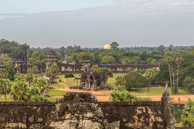 Von hier oben habe ich einen tollen Ausblick Ausblick auf die riesige Tempelfläche. Zwischen dem inneren Tempel und der äußeren Mauer gibt es ein paar Seen und ein paar Gebäude. Am Horizont kann man einen Gasballon besteigen und von dort gegen eine Gebühr die Tempel aus der Luft anschauen. Der Ballon hängt an einem Seil und wird nur aufsteigen lassen und anschließend wieder eingeholt.