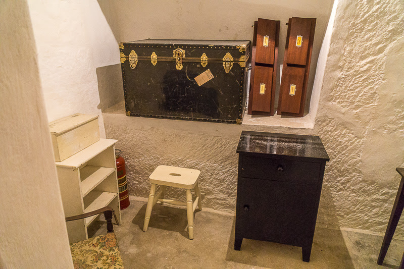 Zu Beginn bekommen wir die Geschichte dieser Tunnel erklärt – auch sie gehen auf die Ritterzeit zurück. Für die Nutzung durch das Militär wurden in die Tunnel kleine Räume eingebaut – Mehrbettzimmer für die Soldaten und ein Einzelzimmer für die Offiziere. Einige wurden wieder eingerichtet, damit man sich das Leben unter der Erde besser vorstellen kann.