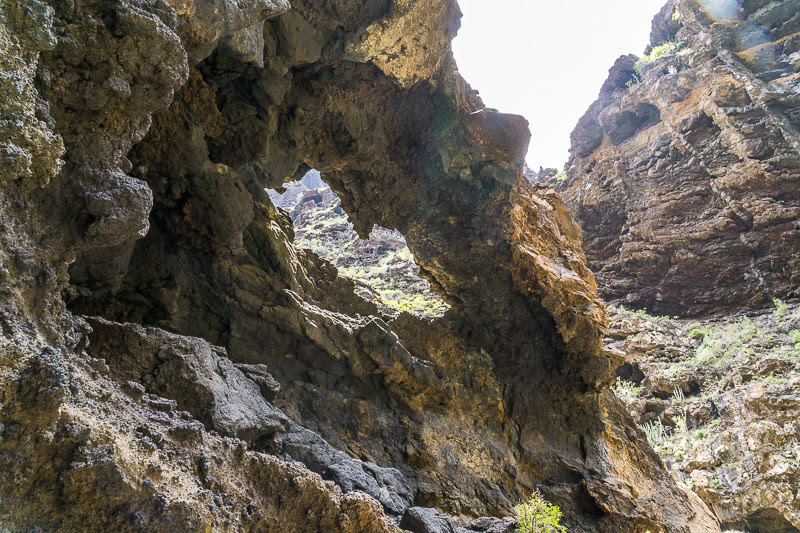 Noch eine letzte Kurve und wir hören schon das Meer rauschen. Hier geht’s nochmal über Felsen und unter ihnen hindurch. Unterwegs kann man noch den Earthcache „Barranco de Masca“ absolvieren – wir hatten das aber schon 2012 erledigt!