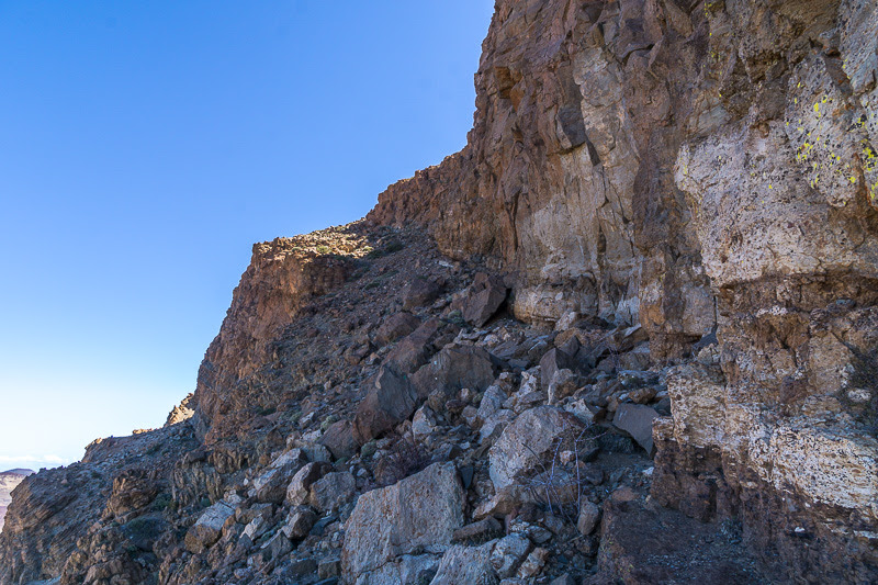Hier sollte man trittsicher und schwindelfrei sein. Ich schaue eh‘ nicht nach unten, sondern blicke lieber auf den Teide, der jetzt in Laufrichtung liegt.
