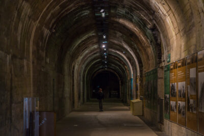 Wie auch bei dem Hohlgangsystem in der V3-Festung Mimoyecques ist dieser Tunnel betoniert. An der Wand hängen Informationstafeln über den Zweiten Weltkrieg.