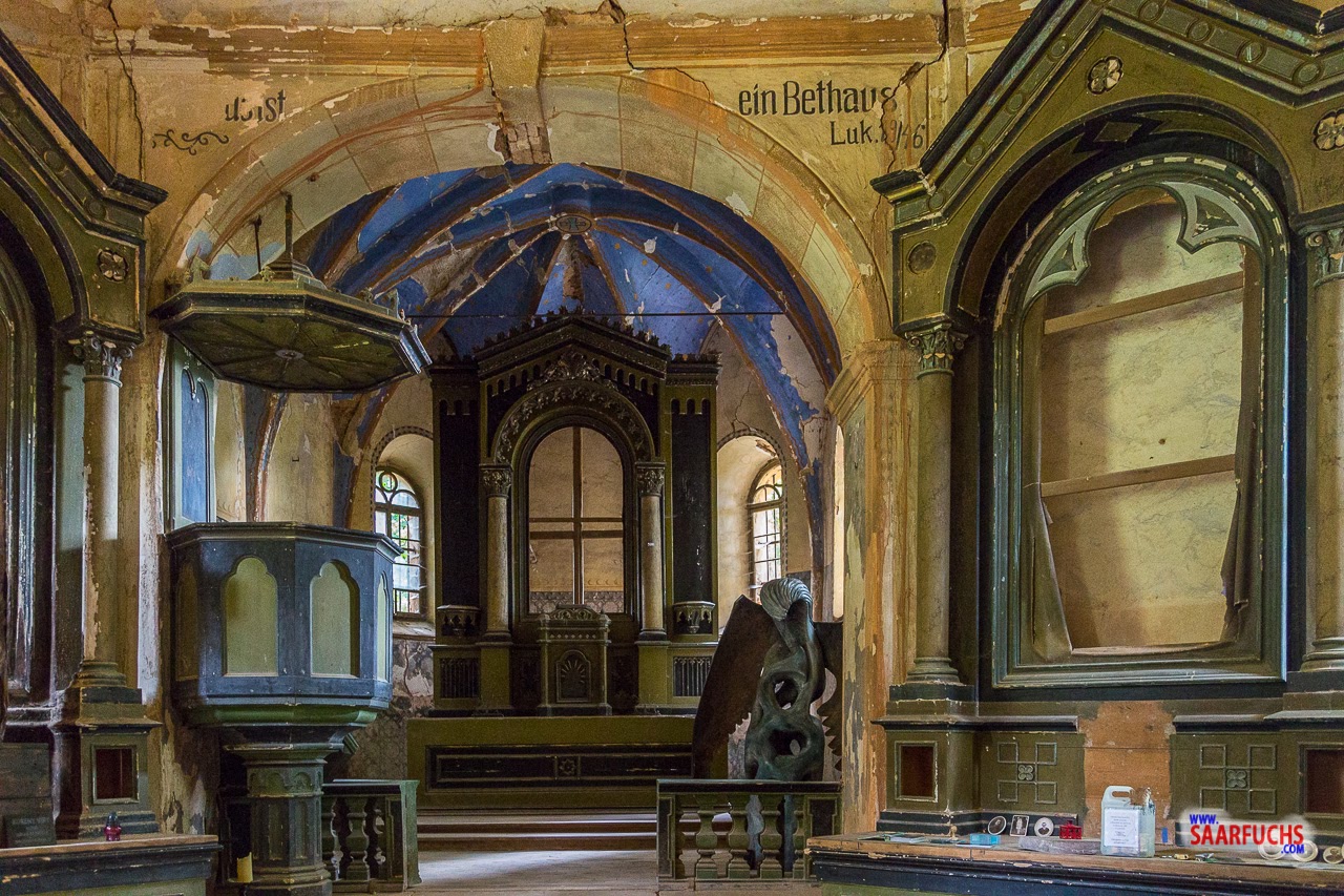 Drinnen blättert der Putz von den Wänden. An manchen Stellen kann ich noch die alte Bemalung erkennen.