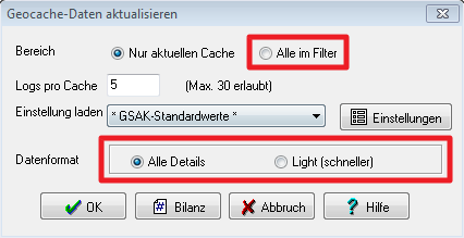 Wollt Ihr die komplette Datenbank aktualisieren, so klickt hier auf ‚Alle im Filter‘. Geht es Euch nur um den Cache-Status (aktiviert, deaktiviert, …) und die Favoritenpunkte, so reicht die Auswahl von ‚Light‘ als Datenformat. Benötigt Ihr auch die persönlichen geocaching.com Notizen, so wählt Ihr ‚alle Details‘. Je nach Auswahl beim Datenformat werden pro Geocache ein Aufruf vom detaillierten API-Kontigent oder vom reduzierten (‚light‘) abgezogen.