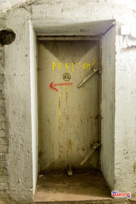 Kurz vor den Eingang werfe ich noch einen Blick in den Raum, wo früher die Lüftungsanlage untergebracht war. Frischluft war hier unten sehr wichtig und wurde mit elektrisch betriebenen Pumpen in die Stollenanlage gepumpt. Bei einem Ausfall der Motoren konnte das Ganze von Hand „gekurbelt“ werden.