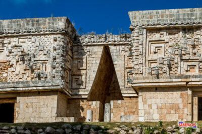 Während unser Reiseführer über unsere Funkheadsets die Geschichte dieser Mayastadt erklärt, nutze ich die Gelegenheit mir den Gouverneurspalast von vorne anzuschauen und ein paar Fotos zu machen. Von der Vorderseite ist die Pyramide des Zauberers gut zu sehen. Klasse, dass wir heute so ein tolles Wetter haben!