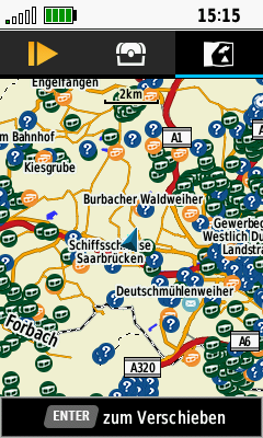 Die „Geocaching“-App entspricht der, die ich im Garmin Oregon 600 gesehen habe – sie besteht aus drei Bildschirmen: in der Mitte wird die Liste der Caches mit der zugehörigen wichtigste Informationen sortiert nach ihrer Entfernung angezeigt. Er dauert einige Sekunden bis die Liste nach dem Starten der App angezeigt wird. Hier reagiert das GPSmap 66s nach meiner Einschätzung „etwas zäh“, was mich doch etwas verwundert.