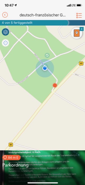 Um die App im Detail zu testen, fahre ich mit saarzwerg in den Deutsch-Französischen-Garten. Dort hat das Team „exilsaarländer“ einen der 250 neuen Adventure Labs ausgelegt. Auf der Startseite der App sind die verfügbaren nach der Entfernung zum aktuellen Standort sortiert.