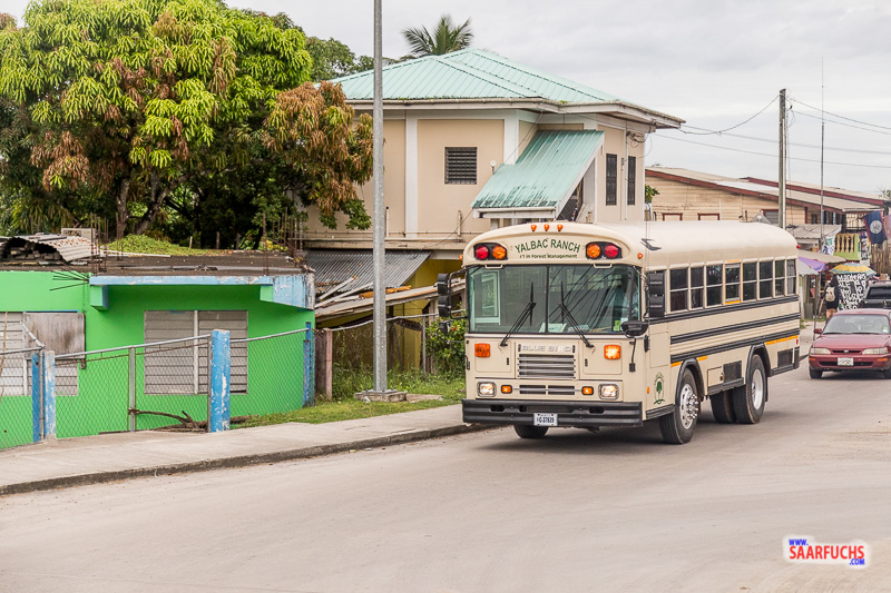 Nach einer guten Stunde sind die Formalitäten erledigt und alle wieder zurück in unserem Reisebus. Von hier bis nach Belize City sind es noch 130 Kilometer. Für die Strecke werden wir noch mindestens 2 Stunden benötigen. Ich genieße die Fahrt und versuche aus dem Bus einige Fotos, die die lokalen Gegebenheiten einfangen sollen, zu schießen. Belize hat scheinbar die ausrangierten Schulbusse aus den Vereinigten Staaten bekommen?