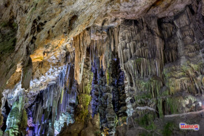 In der Höhle dürfen wir uns frei bewegen – es gibt keine Führung, was wegen dem Earthcache „St. Michael’s Cave“ ganz gut ist. Unmittelbar hinter dem Eingang öffnet sich eine große natürliche Halle, die auch als Veranstaltungsraum genutzt wird. Während unseres Besuches läuft kontinuierlich Musik und die Tropfsteine werden in wechselndem farbigen Licht angestrahlt.