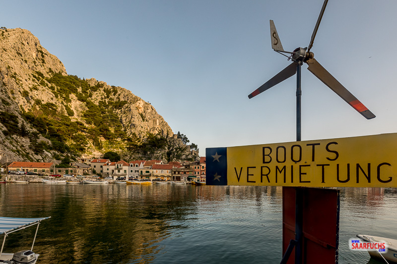 Danach fahren wir wieder eine knappe Stunde nun flussabwärts nach Omiš zurück. Bei der Einfahrt in den Ort liegt dieser schon in einem warmen Abendlicht.