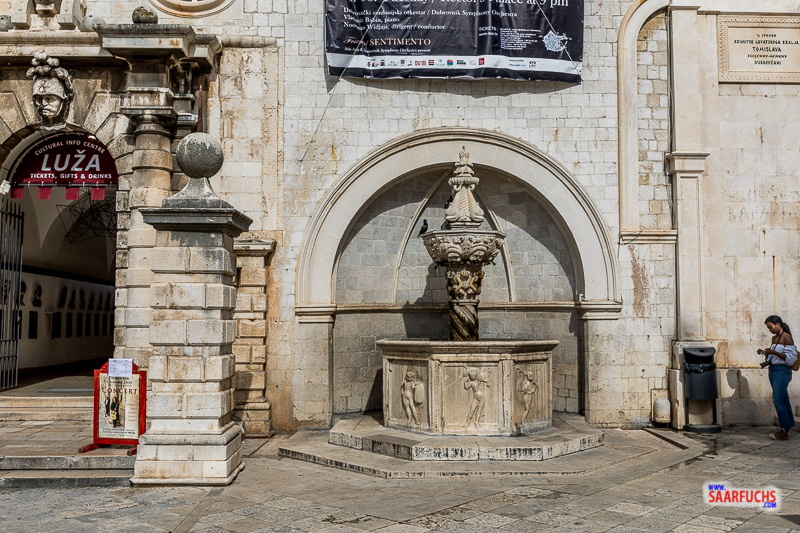 Wir betreten die Stadt von Westen her durch das Pile-Tor. Dahinter ist ein Platz mit einem großen Wasserspeicher. Die Stadt ist voll von Touristen. Ich schminke mir ab ein Foto ohne sie machen zu können.