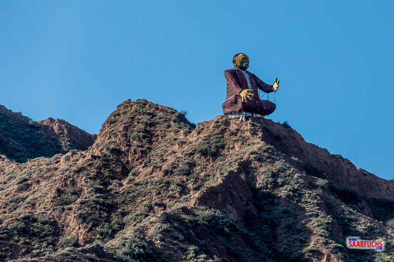 Die Hügel entlang dieser Hauptverkehrsader nach Osten werden viel für Werbung genutzt. Besser gefällt mir dann schon die „Werbung“ für Kirgistan mit der Landesflagge. Wer die wohl dahin „gebastelt“ hat?