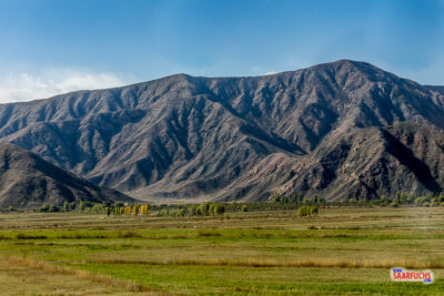 Am nächsten Morgen treten wir recht zeitig die lange Rückfahrt nach Bischkek an. Auf der Südseite des Yssykköl sind die Straßen schlechter ausgebaut und so zieht sich unsere Busfahrt etwas hin. Unterwegs machen wir ein paar kleinere Fotostopps. Hier zum Beispiel an einer Aprikosenplantage direkt am See. Die Blätter der Bäume sind schon rot gefärbt.