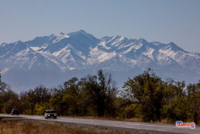 Wir fahren immer längs der hohen Berge, die die Grenze zwischen Kasachstan und Kirgistan bilden.