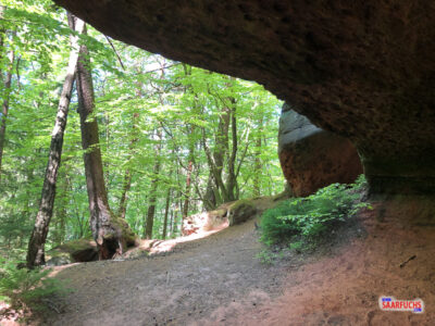 In der Nähe können wir den gleichnamigen Tradi Felsenland Pfalz: 1. Pirmasenser Felsentor suchen. Dazu müssen wir kurz den Wanderweg verlassen und den steilen Hang hinaufklettern. Oben werden wir von einem großen Felsendach überrascht, welches schon fast wie eine Höhle wirkt.