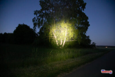Mit dem gebündelten Lichtstrahl kann ich auch noch weiter entfernte Bäume anleuchten. Wäre daran der Reflektor eines Nachtcaches, so würde ich ihn sehen können.