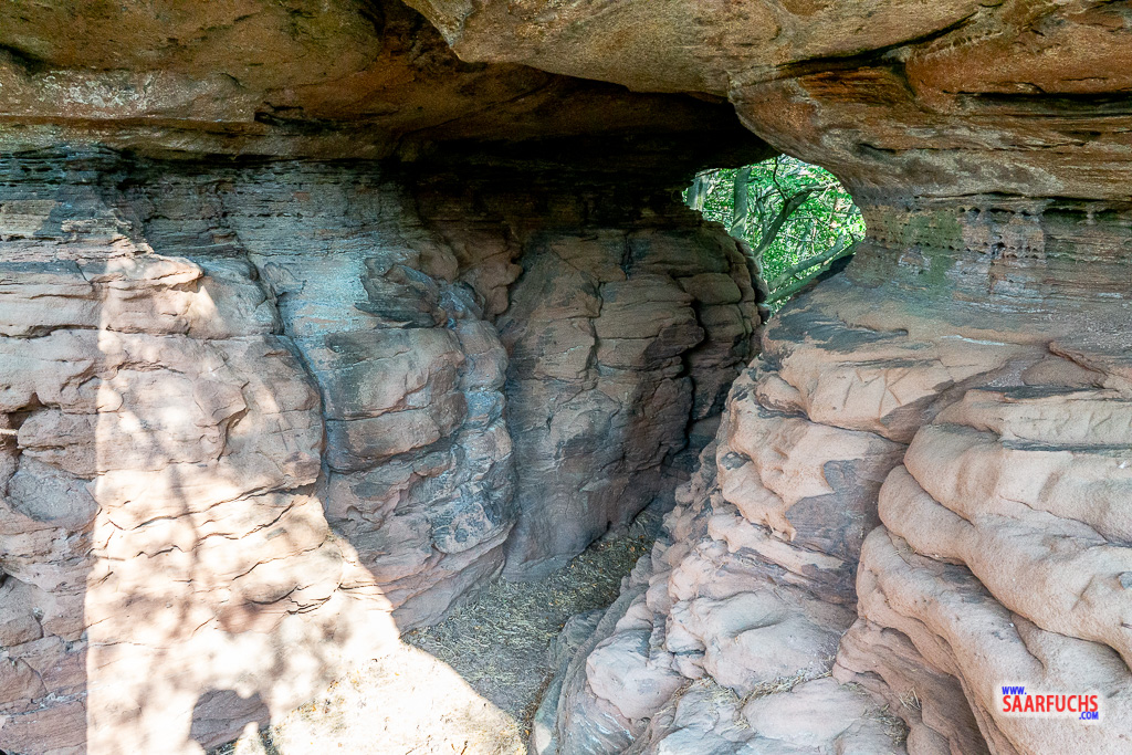 Ich steige wie im Hint beschrieben auf die erste Ebene hinauf. Dort ist eine kleine Öffnung im Fels, durch die ich auf die andere Seite gelange, wo es senkrecht nach unten geht. Das begrenzt das Suchfeld. Ich habe jedoch so meine Mühe die große Dose zu finden. Irgendwann bekomme ich einen Geistesblitz und greife beherzt zu. Kurz danach trage ich saarzwerg und mich ins Logbuch ein.