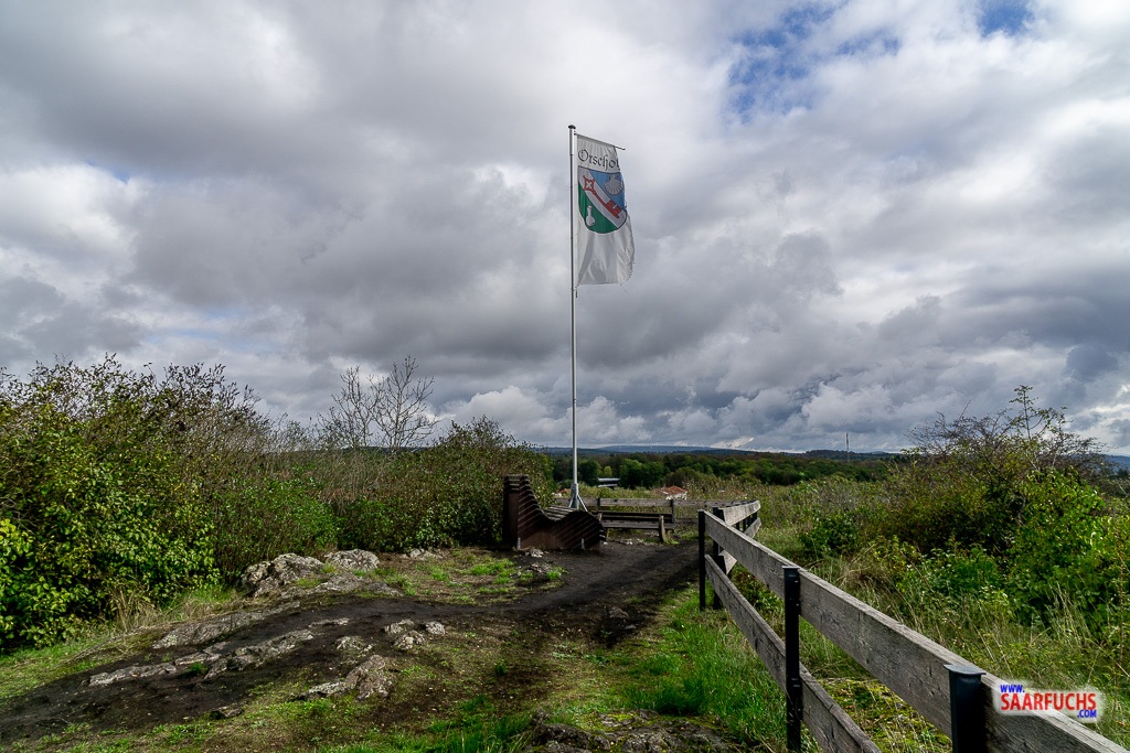 Am Aussichtspunkt stehen ein Fahnenmast und eine Sinnenbank. Für eine Pause ist es uns aber noch zu früh, wir sind noch nicht einmal den ersten Kilometer gewandert. So schauen wir uns nur etwas um. Links vom Aussichtspunkt sehen wir auf Orscholz.