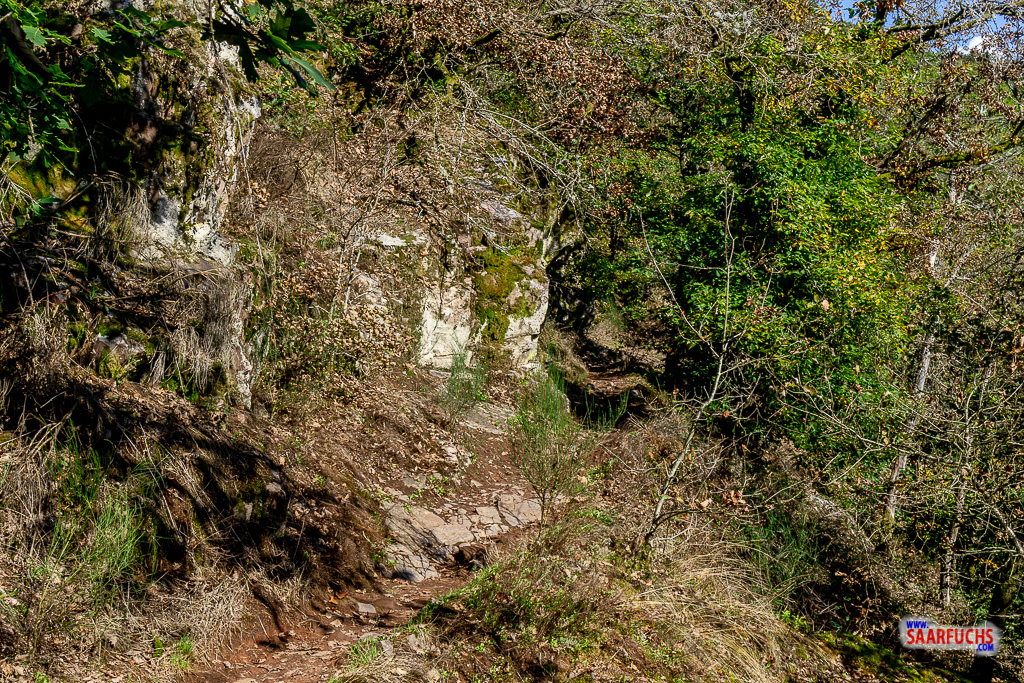 Wir starten unseren Abstieg hinunter zur Saar über einen recht breiten Weg, der durch den Steilhang verläuft. Rechts geht’s steil bergauf und links kann ich hinunter ins Tal des Steinbachs schauen.