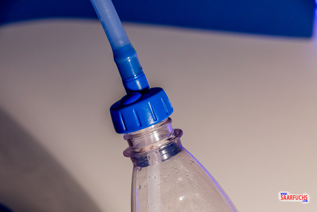 Tipp 1: Naja, zumindest, wenn Ihr nicht den gleichen Fehler macht, wie ich: Ihr solltet keine Flaschen mit kohlensäurehaltigen Getränken an den Adapter anschließen. Unter Druck neigt das geschlossene Ventil zum Tropfen. Und wenn ihr es aufdreht, schießt das Getränk unter hohem Druck aus dem Ventil, was unangenehm werden kann. Bei Verwendung von Wasser ist das zugedrehte und auch geöffnete Ventil solange dicht bis ihr auf das blaue Gummi beißt. Von allen Trinksystemen, die ich bisher in Benutzung habe, empfinde ich dieses Ventil am Angenehmsten zum Trinken.