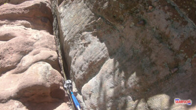 Nun kommt der große Spaß, der lange Abseiler durch die hohe Westwand. Auf dem folgenden Bild habe ich Euch den Abseilhaken rot markiert.