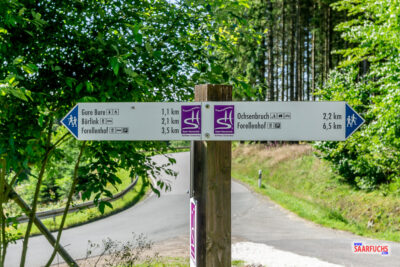 Die Traumschleife Börfinker Ochsentour wurde das erste Mal im Jahr 2015 als Premiumwanderung zertifiziert und wurde 2018 mit 71 Erlebnispunkten ausgezeichnet. Was mich an den Wegweisern am Parkplatz jedoch wundert ist, dass ich, wenn ich die Entfernungen zum Forellenhof zusammenzähle, auf zehn Kilometer statt der angegebenen neun komme. Am Ende unserer Wanderung habe ich auf meinem GPS 10 Kilometer und 300 Höhenmeter.