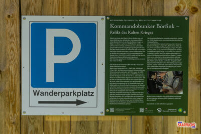 Falls Ihr Euch ein wenig für Militärgeschichte und Bunker interessiert, solltet Ihr Euch die Rückseite der Tafel anschauen: Dort findet Ihr ein paar Informationen zum Kommandobunker Börfink, an dessen Zufahrt wir unser Cachemobil abgestellt haben und nach dem dieser Wanderparkplatz benannt wurde.