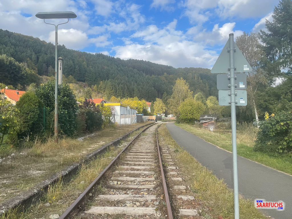 Auf den Bahnschwellen befindet sich alle 500 Meter eine Entfernungsmarkierung, die in unserer Fahrtrichtung rückwärts zählt, wir wissen also zu jedem Zeitpunkt genau, wie weit es noch bis zu unserem Ziel in Altenglan ist. Vor jeder Ortsdurchfahrt steht an der Strecke ein Ortsschild.
