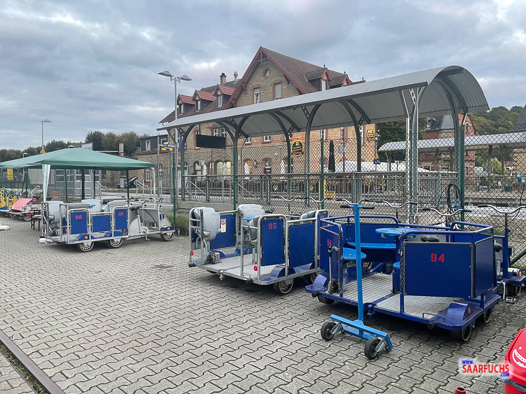 Da wir am Samstag, dem 16. Oktober, starten, fahren wir von Staudernheim nach Altenglan. Es ist auch möglich nur die halbe Strecke zu fahren und die Draisine in der Mitte in Lauterecken zurückzugeben. Da wir anschließend den Abend zünfitig in einem Restaurant beenden wollen, parken wir unser Cachemobil in Lauterecken und fahren mit dem ÖPNV nach Staudernheim, wo wir kurz nach elf Uhr ankommen. Bis die Formalitäten und die Einweisung erledigt sind, dauert es noch eine knappe halbe Stunde. Gegen halb zwölf radeln wir dann los.