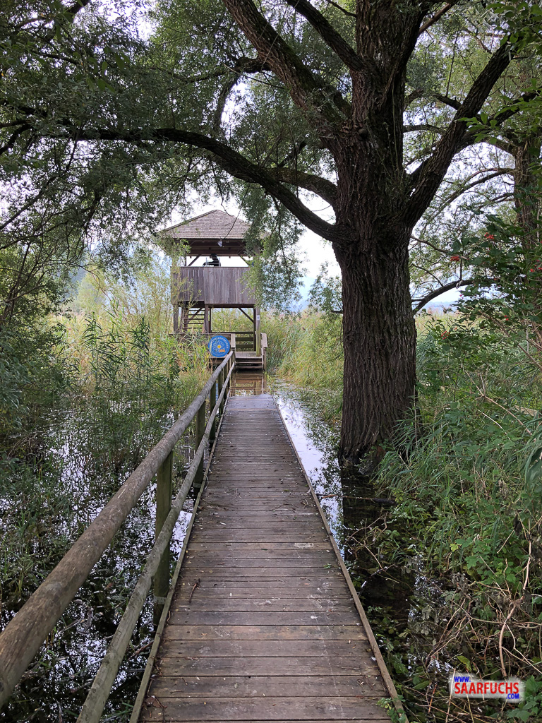 Kurz hinter dem Schild kommt die erste überflutete Stelle. Sie ist nicht tief und wir fahren langsam und ohne Probleme hindurch. Danach nähern wir uns Felden. Am dortigen Beobachtungsturm ist die erste Information für unser LabAdventure abzulesen. Leider muss ich feststellen, dass auch der Zugang zum Turm überflutet ist, und zwar so hoch, dass das Wasser in meine Radschuhe hineinlaufen würde.
