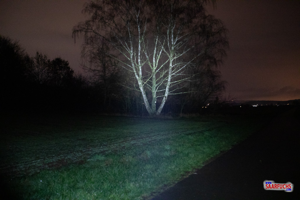 Ich schalte die Fenix TK25 UV im Weißlicht-Modus ein. Der Baum ist geschätzte 20-30 Meter von mir entfernt. Die Lampe leuchtet nun auf der schwächsten Stufe „Dunkel“.