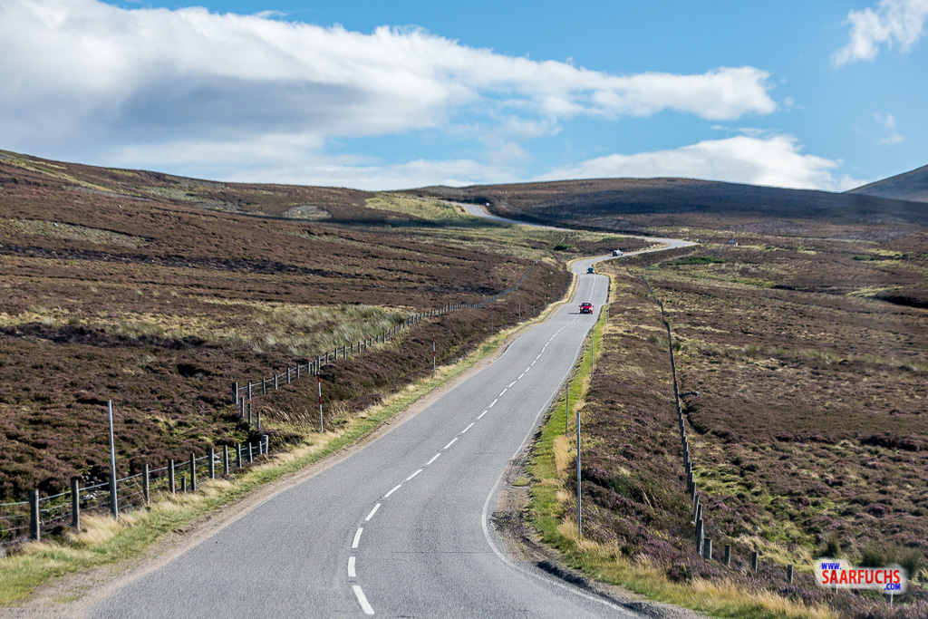 Unsere Fahrt führt uns über den 670 Meter hohen Cairnwell Pass, wo einige Skilifte auf Schnee warten. Danach geht es auf einer kurvigen, aber gut ausgebauten Straße wieder nach unten.