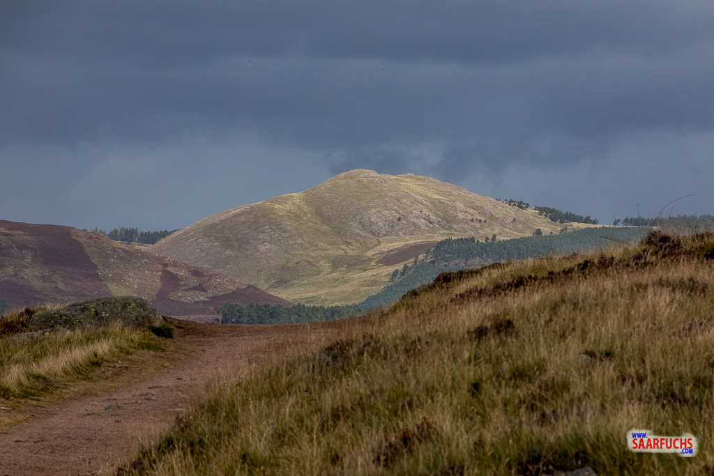 Am nächsten Morgen unternehmen wir einen weiteren Spaziergang durch Ballater und fahren anschließend zum Loch Muick. Als wir dort gegen halbzwölf Uhr ankommen, ist der kleine Parkplatz hoffnungslos überfüllt. Wir finden eine kleine Parkmöglichkeit an der Straße einen guten Kilometer zurück. Um uns herum erheben sich viele kleine und große Hügel. Das Wetter heute morgen ist leider nicht so toll, es sieht regnerisch aus und es weht ein kalter Wind.