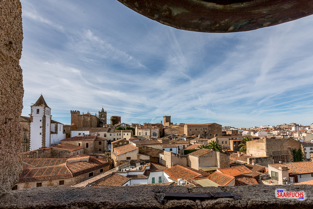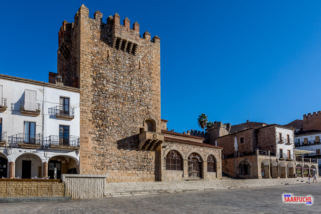 Hinter der Kirche biegen wir in eine schmale Gasse ein und stehen nur ein paar Augenblicke später schon auf der Plaza Mayor, dem Hauptplatz von Cáceres. Er liegt am Eingang zur historischen Altstadt. In der Lücke rechts neben dem großen Turm führen die Treppen nach oben zum Stadttor „Arco de la Estrella“.